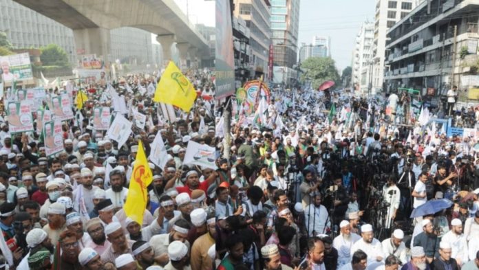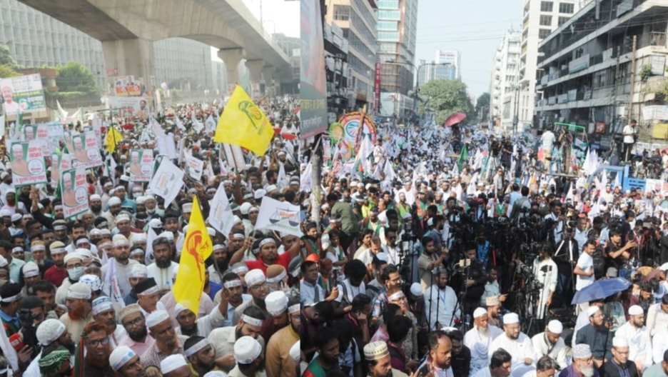 রাজধানীর পল্টন মোড়ে জুলাই সনদ বাস্তবায়ন আদেশ জারি ও নভেম্বরে গণভোট অনুষ্ঠানের দাবিসহ পাঁচ দফা দাবি নিয়ে জামায়াতে ইসলামী ও সমমনা আট দলের মহাসমাবেশ শুরু হয়েছে।