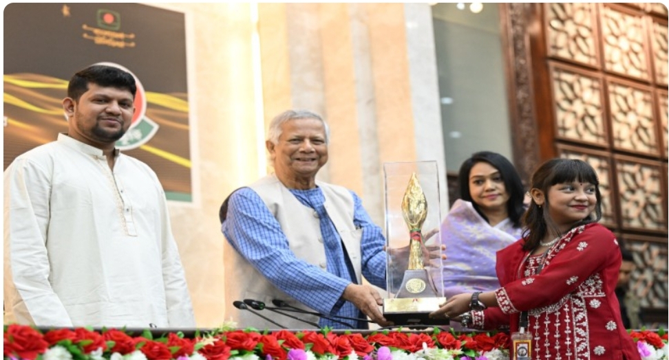 গত ১৩ নভেম্বর, বৃহস্পতিবার, উপদেষ্টার কার্যালয়ের শাপলা মিলনায়তনে প্রধান উপদেষ্টা ড. মুহাম্মদ ইউনূস প্রেয়সীর হাতে চ্যাম্পিয়ন ট্রফি ও তিন লাখ টাকার পুরস্কার তুলে দেন।